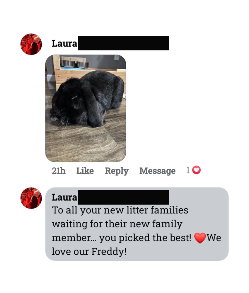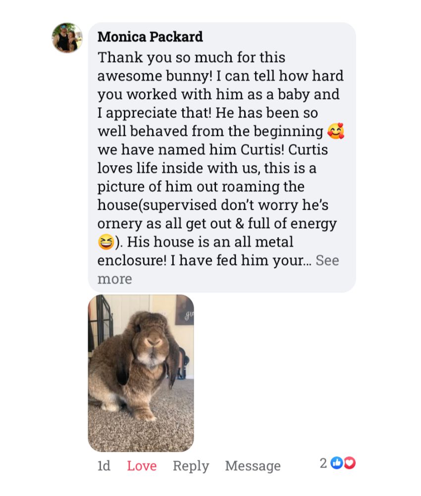 I have not asked people to say these things. They are kind words from people who have left comments or emailed us after they have purchased their rabbit.